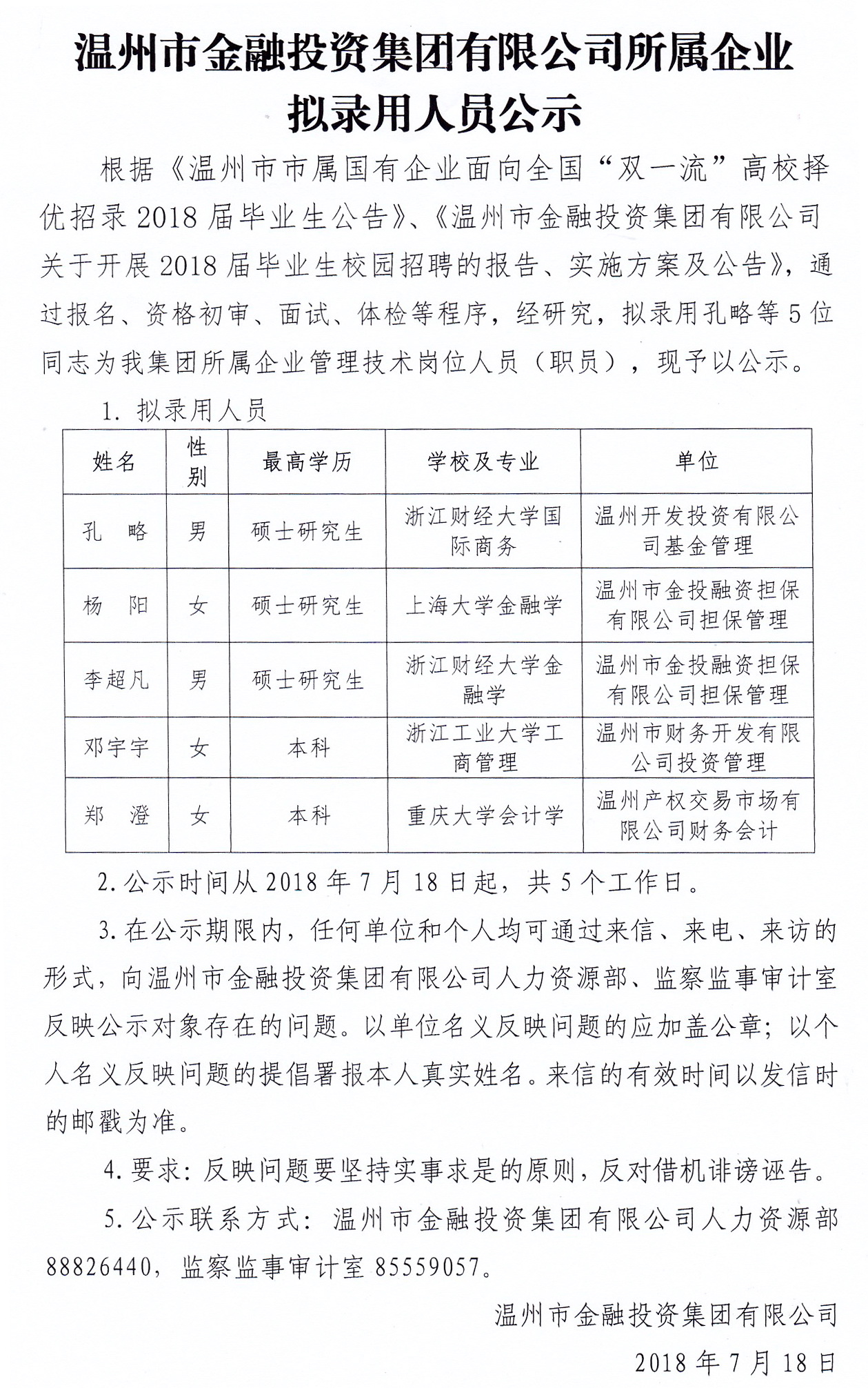 温州市金融投资集团有限公司所属企业拟录用人员公示