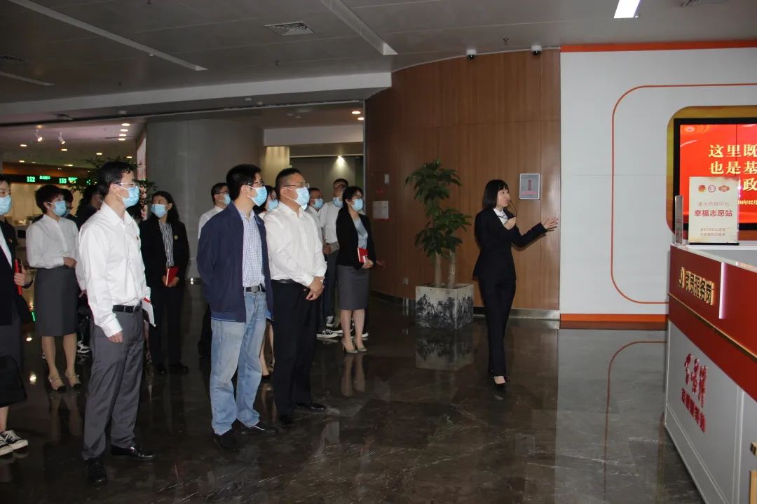 李耕一行人在市政务服务局讲解员的介绍下先后参观了市民中心导办台、相关便民办理窗口、党群微家、公共资源交易场所设施设备及其廉政走廊,学习了解市政务服务局的党风廉政建设以及对外服务措施。